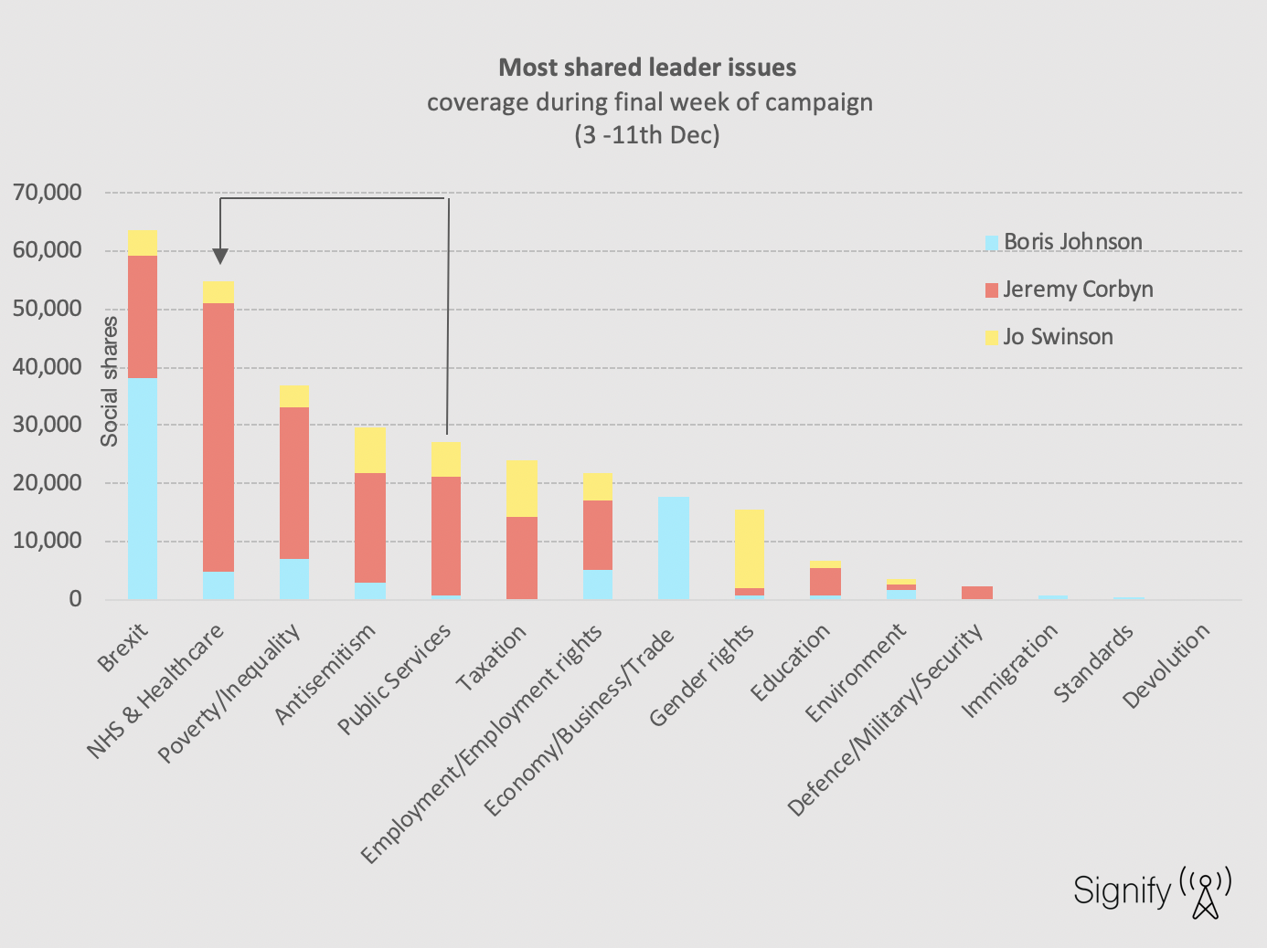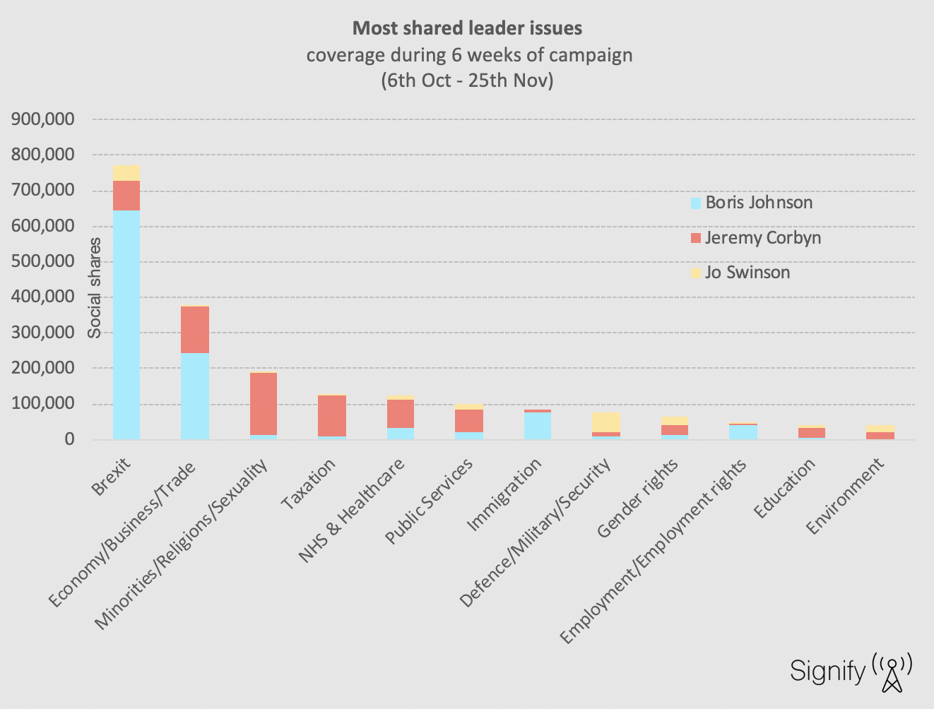As expected, Brexit was by far the most significant issue during the campaign, with more than double the social shares vs other issues in the 6 weeks leading up to 25th November. Whether positive or negative, it was Johnson’s personal association to this issue, in comparison to the lack of awareness with his opponents, that led as much as anything else to the resounding Conservative victory. In contrast, Brexit didn’t even register in Jeremy Corbyn’s top three issues (something Labour HQ may have intended given the party’s less decisive stance on the issue).
