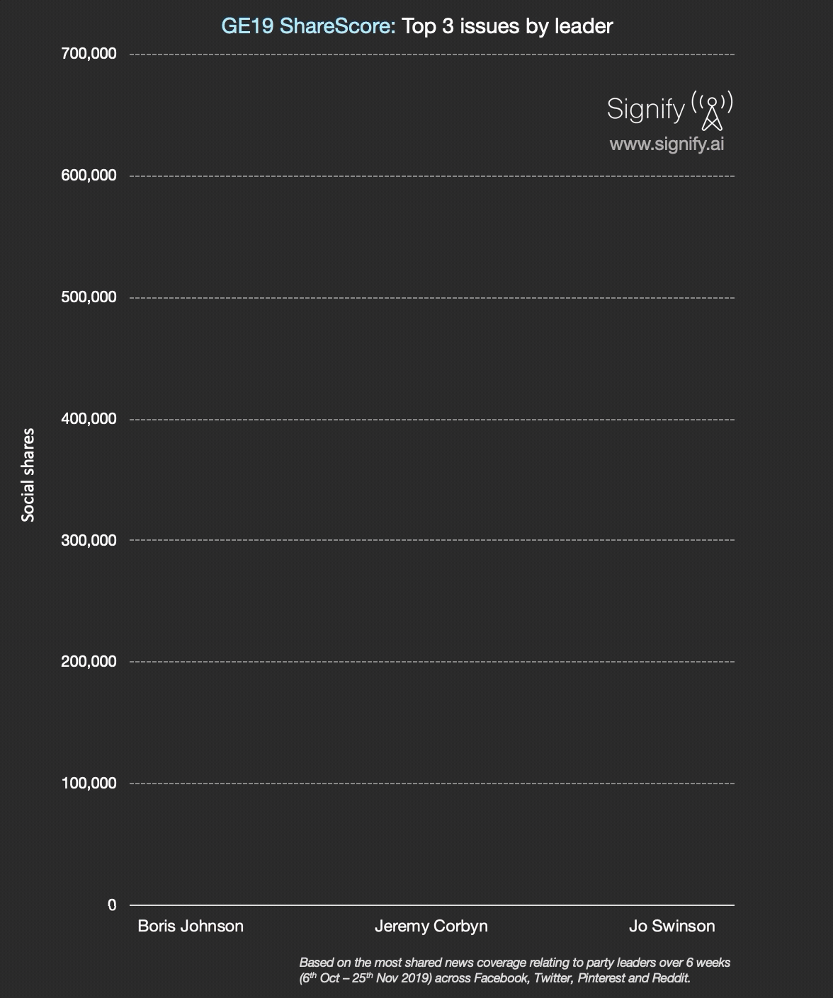 Signify use machine learning to provide data-driven insights into what audiences care about. Using our proprietary technology, we looked at social media data across Facebook, Twitter, Pinterest and Reddit, to identify the most shared news coverage relating specifically to party leaders over 6 weeks (6th Oct – 25th Nov 2019). The results were clear:
